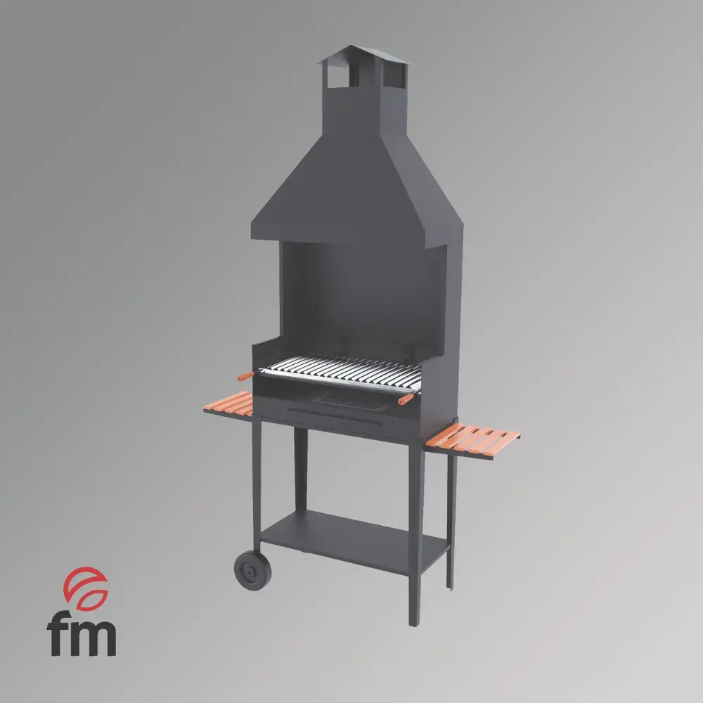 El BV-84 es un asador de acero robusto, con parrilla inoxidable regulable a 3 alturas. Incluye parrilla de fundición, cajón cenicero, mueble con ruedas, paravientos y campana, ofreciendo una experiencia completa para asados al aire libre.