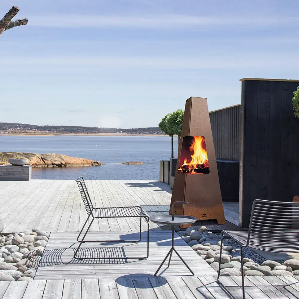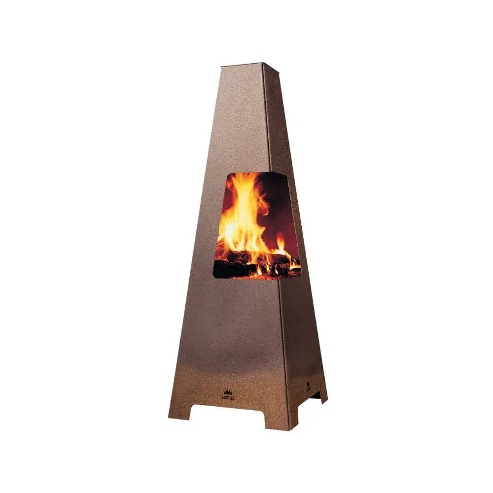 La Jøtul Terrazza XL es una chimenea de exterior de gran capacidad, con un diseño abierto a dos caras y fabricada en acero Corten. Ofrece una experiencia de fuego elevada y un acceso cómodo a su parrilla opcional para barbacoa.
